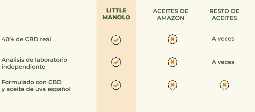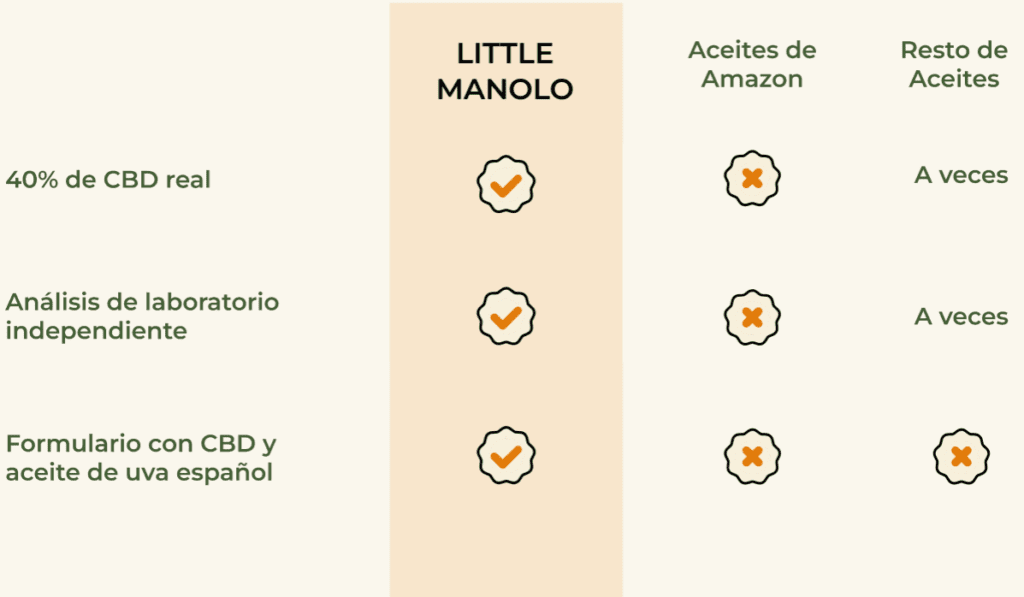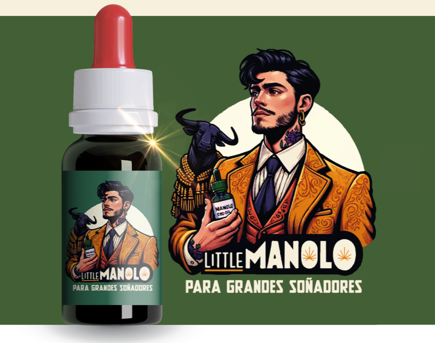 Little Manolo es un aceite con 40% de cannabidiol (CBD) aislado y una base oleosa que combina aceite MCT (coco) con aceite de semilla de uva. Este primer aceite de Little Manolo se vende en un tarro de 10ml verde con gotero rojo y blanco. Es un producto 100% español a un precio muy asequible, que huye de la falsa idea de que para comprar barato hay que recurrir a productos elaborados fuera de nuestras fronteras que luego nos llegan con un millón de defectos. Con Little Manolo, lo que compras es igual a lo que recibes. Sin sustos, con simpleza y honestidad.